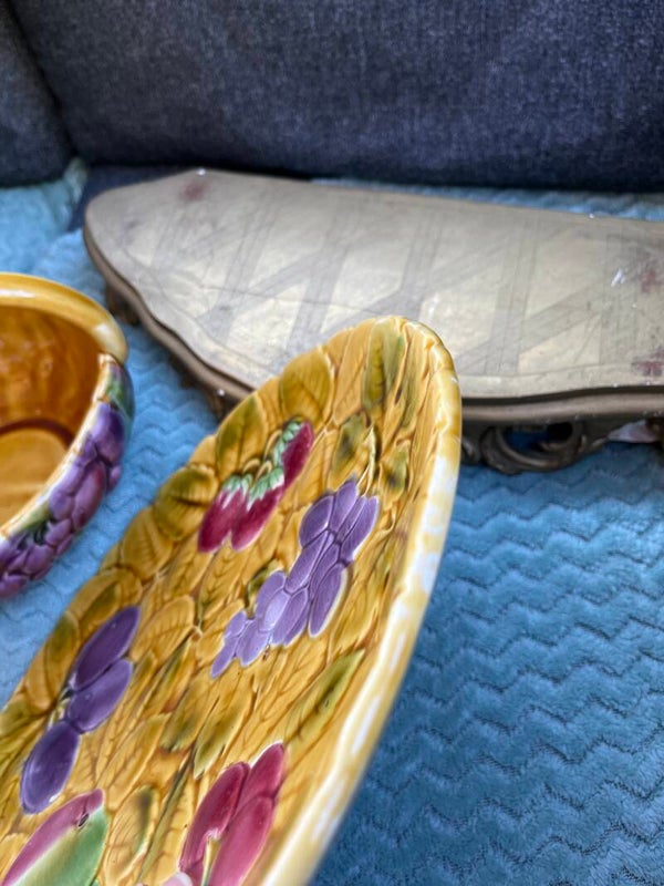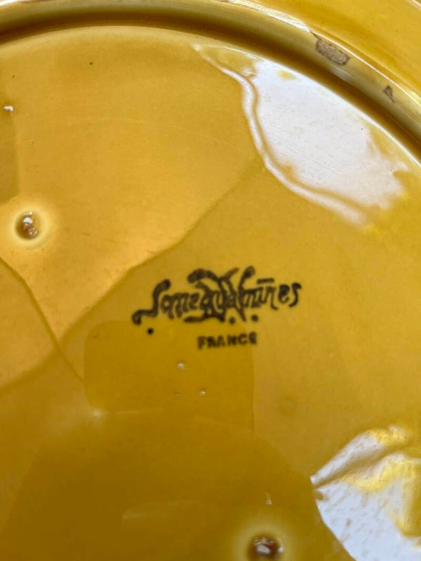 Mooie Barbotine schaal van Sarreguamines France. Mooi mosterdgele kleur met diverse soorten fruit in reliëf. De schaal heeft wat gebruikssporen rond de randjes, de prijs is daarop aangepast.