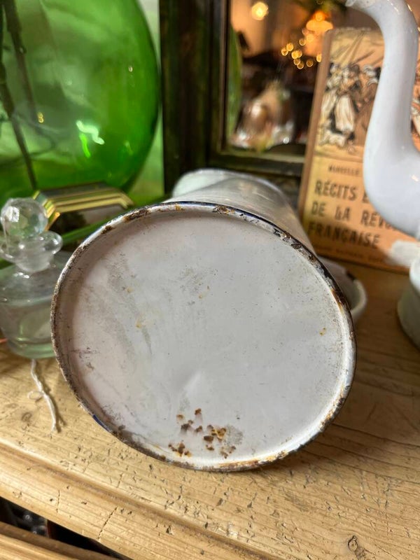 Leuk emaille kannetje in wit met blauw randje, 20,5 cm hoog t/m tuit