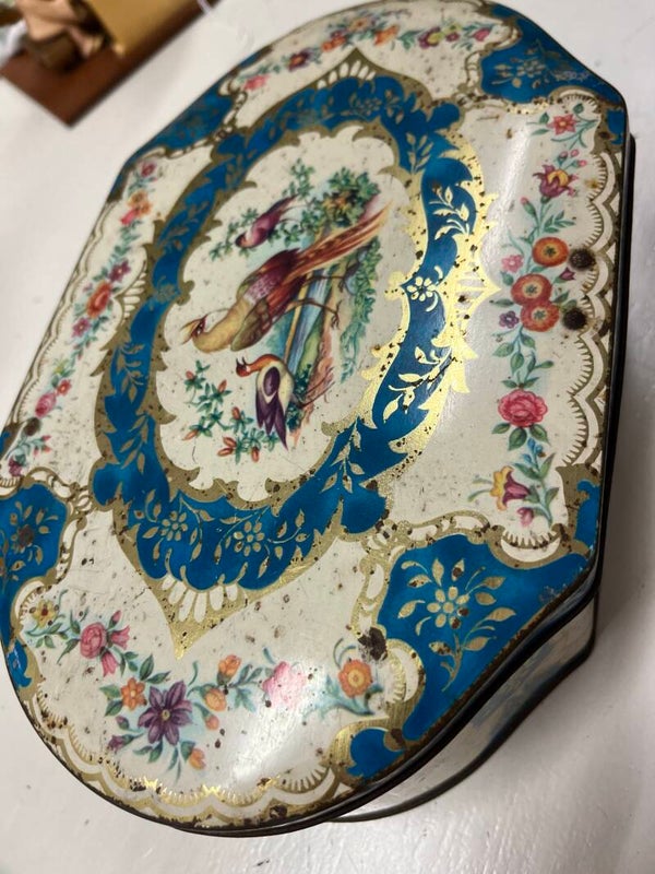 Prachtig oud blik van côte d'or, met prachtige kleuren en drie vogels bovenop.