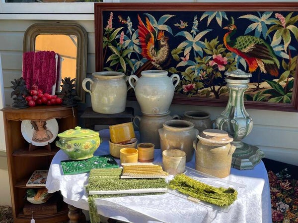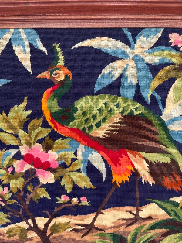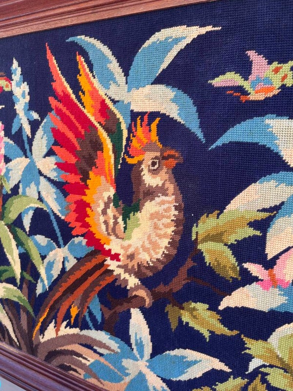 Uit Frankrijk meegebracht: mooie grote zware lijst met petit point- geborduurd paneel in vrolijke kleuren met daarop paradijsvogels.