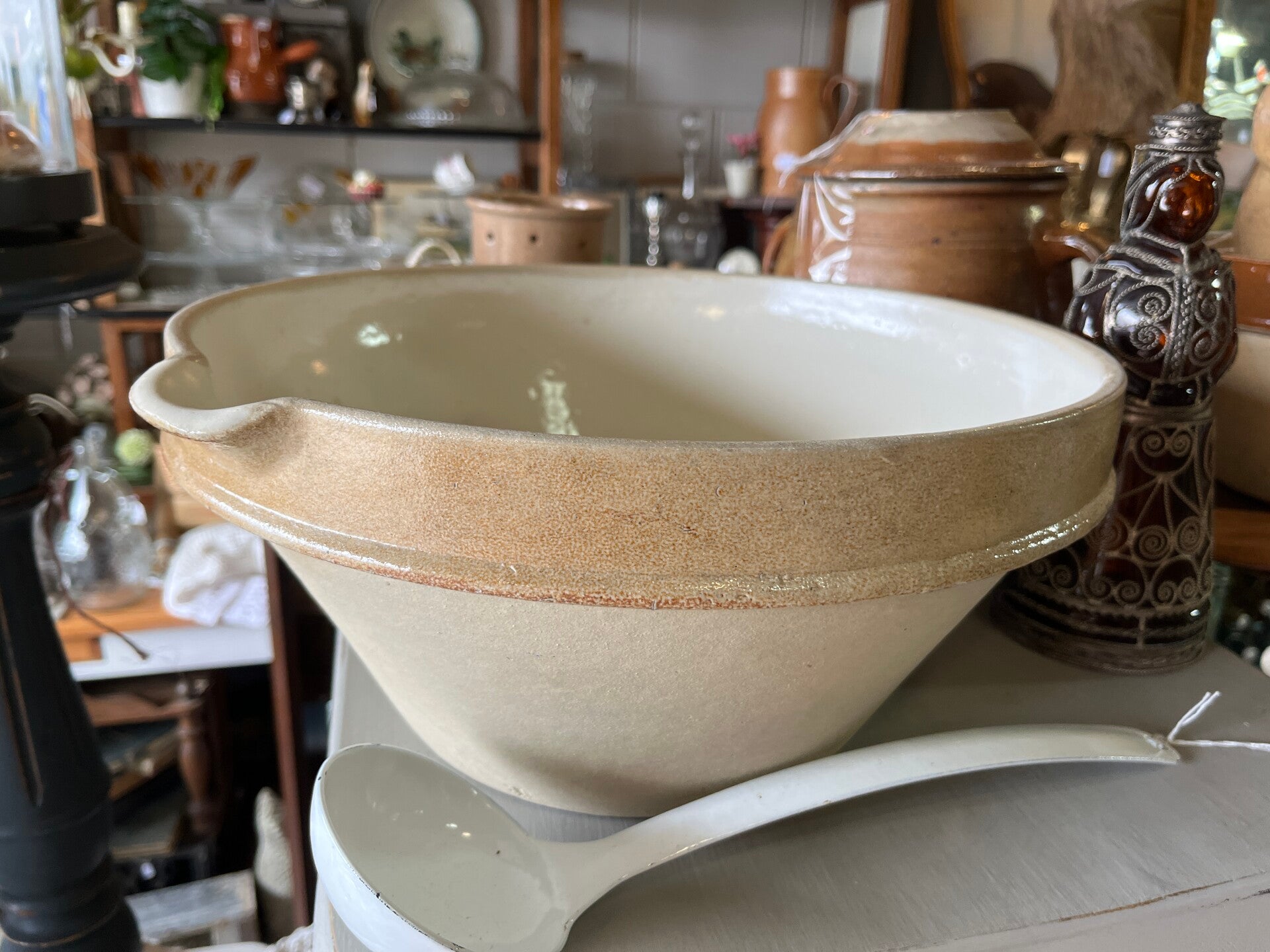 Prachtige grote Franse gresale of beslagkom. Zandkleurig aardewerk. De binnenkant en de rand zijn geglazuurd, de buitenkant niet. In prachtige staat! Hij is maar liefst 35,5 cm in doorsnede en heeft een hoogte van 17 cm.