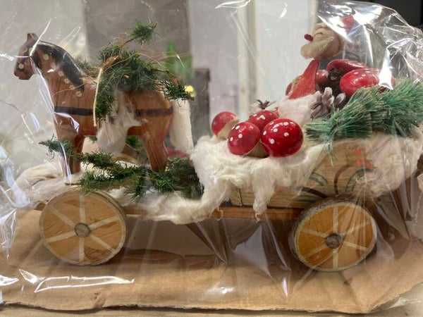 Houten paard met kerstman in de slee. Gedecoreerd met groen en paddenstoelen. 22 cm lang en ca 15 cm hoog