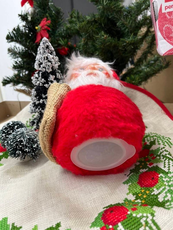Vintage Candy container in de vorm van een kerstman, met rood pluche bekleed, plastic dop onderop. ca 17 cm hoog.