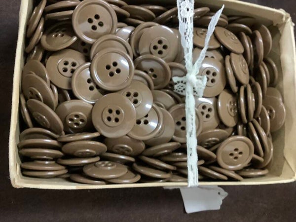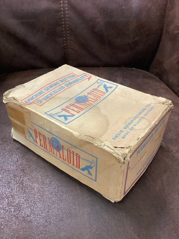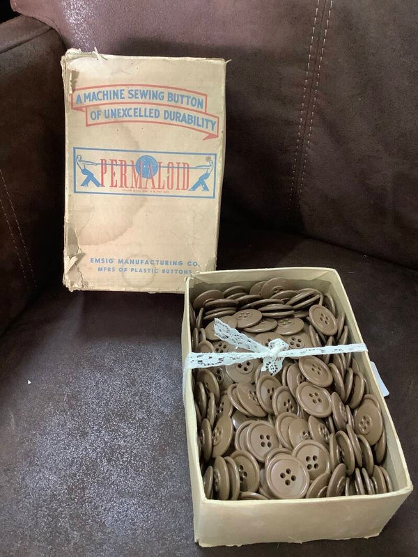 Vintage doos helemaal vol met oude Permaloid knopen, USA, New York. Elke knoop is 2,5 cm doorsnede.