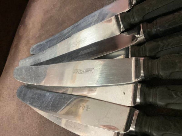 Set van 8 Gero roestvrijstalen messen met mooi bewerkte Bakelieten handvatten, ca 1950. Bakeliet is licht in gewicht dus makkelijk hanteerbaar.