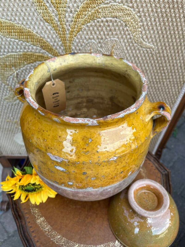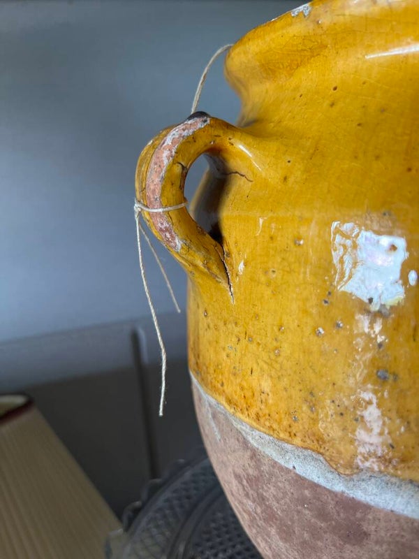Prachtige antieke Franse confitpot, aardewerk met geel geglazuurde bovenkant en binnenkant. In mooie shabby geleefde staat. Ca 100+jaar oud, dus kijk goed naar de foto's voor de staat. Hij is 25 cm hoog en heeft twee oren.