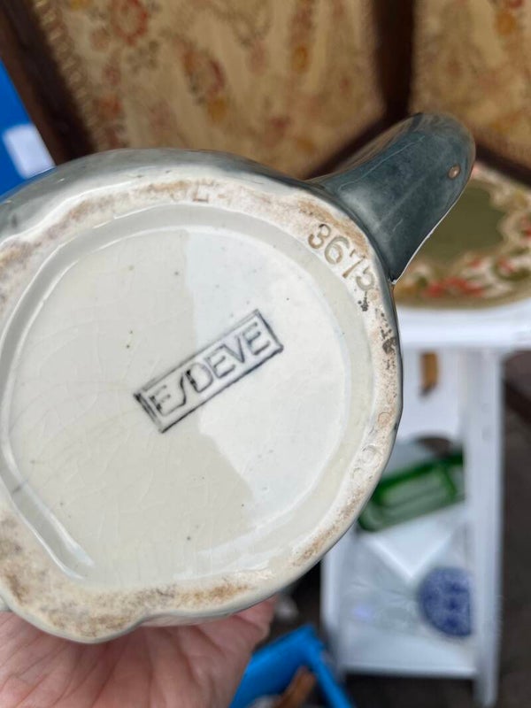 Zeldzame waterkan in de vorm van een kat, merk Esdeve. Nummer 3675. Deze kan is kleiner dan de bekende eenden, hij is 21 cm hoog. Hij is ca 1920 gemaakt, heeft wat schade aan zijn tongetje, daarop is de prijs aangepast. Onbeschadigd zijn ze over de €100,- zie foto's voor de staat.