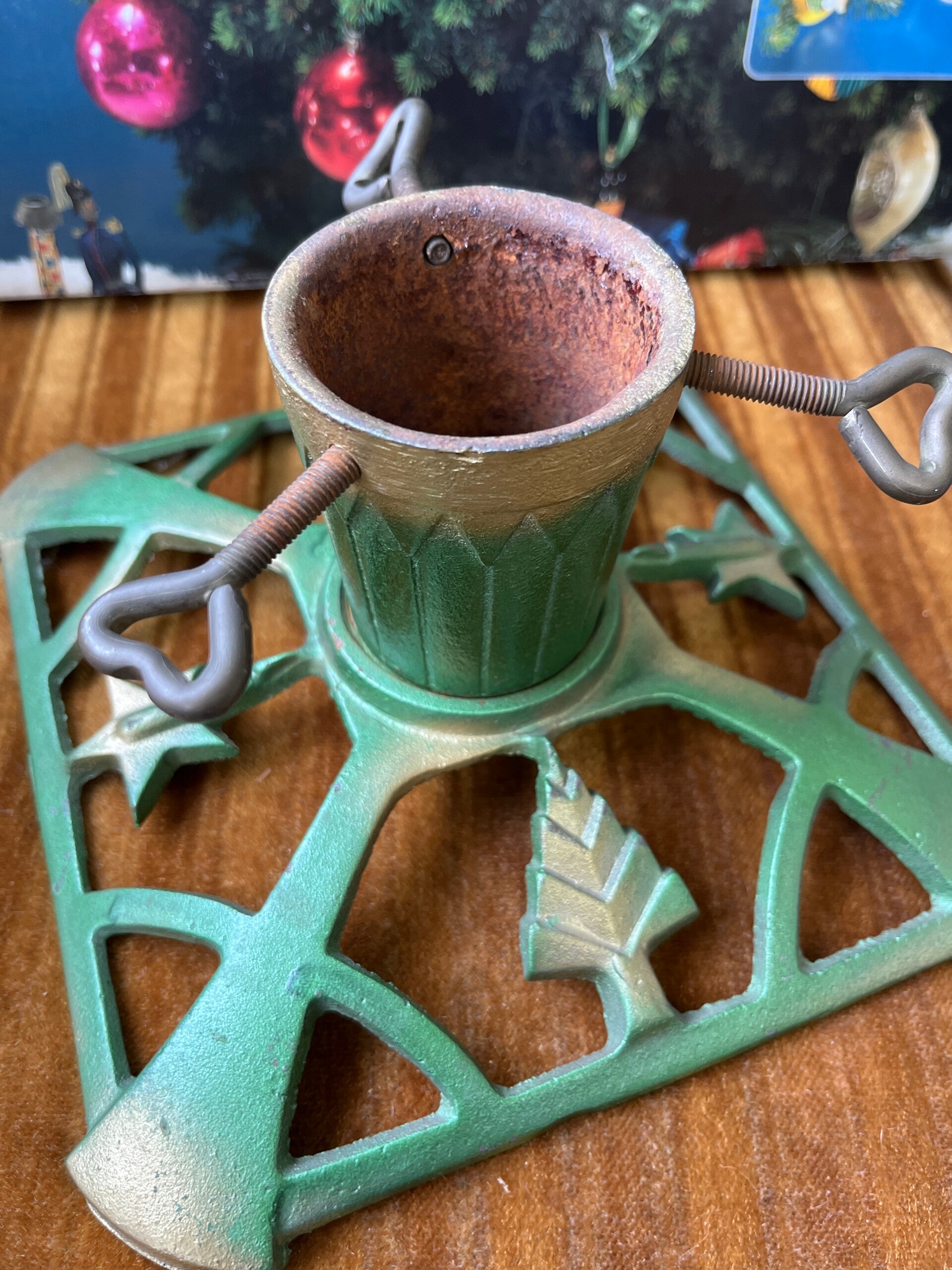 Mooie gietijzeren kerstboom standaard uit Duitsland. Groen met goud, inclusief de drie schroeven. Decoratie rondom, kerstboompjes en sterren.