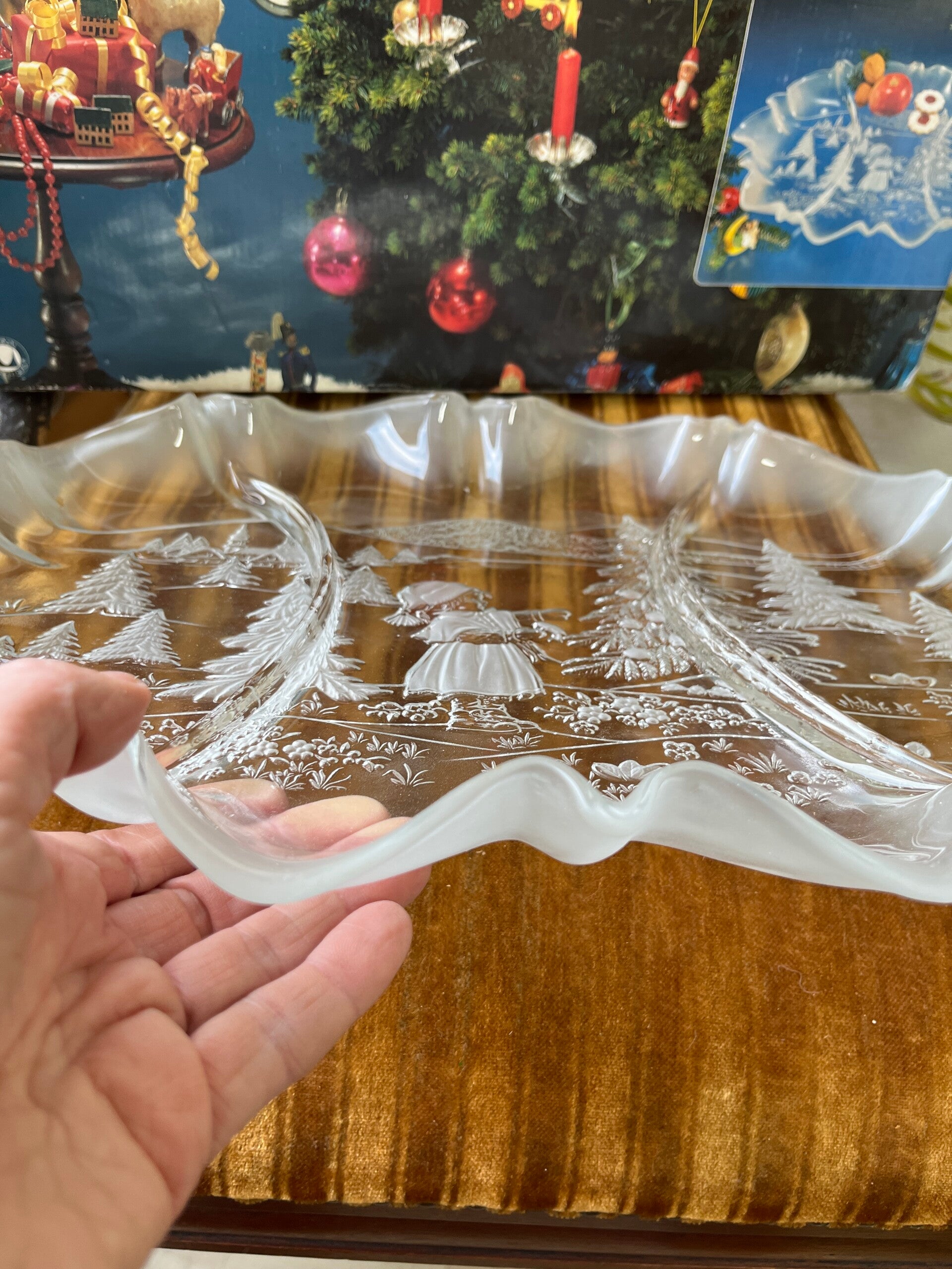 Prachtige vintage vakkenschaal van Walther glass, met schitterende decoratieve afbeeldingen. Het reliëf zit aan de onderkant, en is "frosted". Inclusief de originele doos, die wel wat shabby is. De schaal heeft een prachtige geschulpte rand en is in perfecte conditie.