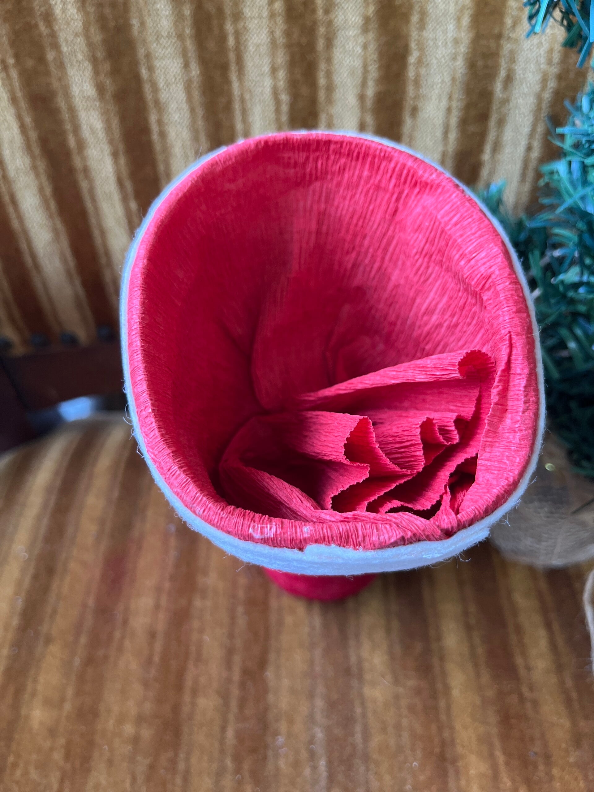 Grote kaars met flock en vilt. Binnenin nog het rode crêpe papier waaronder het snoep werd verstopt. 17,5 cm hoog.